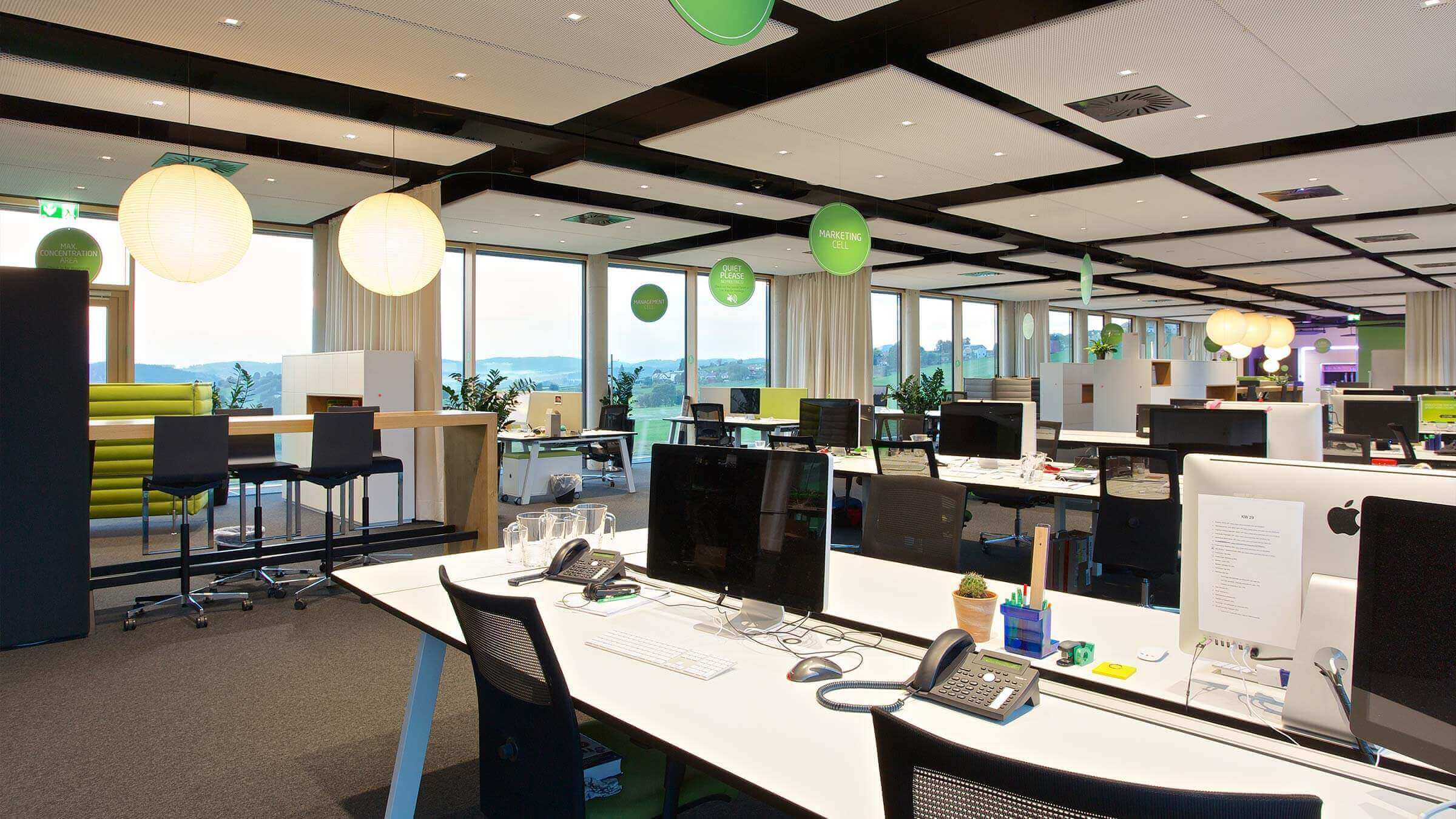 Velmi důmyslné pojetí akustiky umožňuje koncentrovanou práci také v otevřeném prostoru. Zvláště díky polstrovaným stropním panelům potaženým 3D látkou, v nichž je integrováno osvětlení a jsou důmyslně rozmístěny. Dalším pomocníkem jsou zvukově odolné závěsy mezi segmenty open spacu.