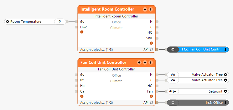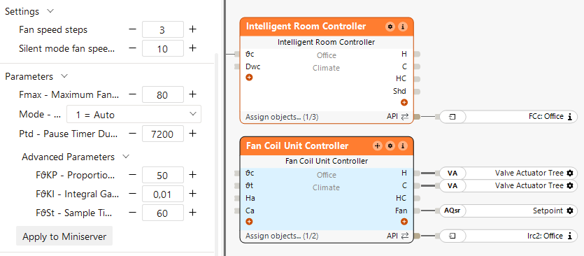 Über den API Connector kann die Fan Coil Steuerung mit der Intelligenten Raumregelung verbunden werden: