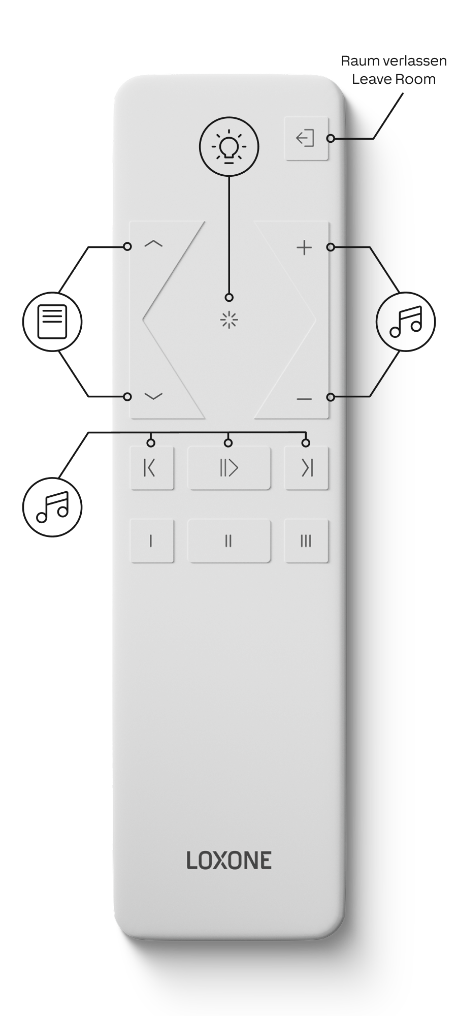 Der bewährte LOXONE Tastenstandard sowie zusätzliche Tasten zur Audiosteuerung. All das in einem hochwertigen Design.