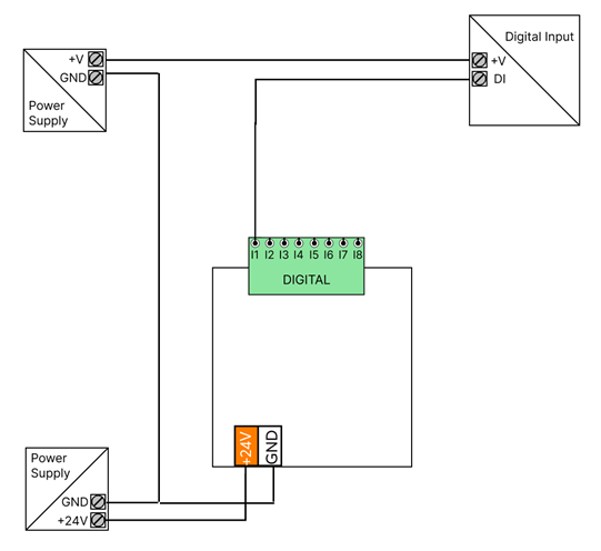 Connect the Extensions to a Miniserver by daisy-chaining the Link interfaces. If any of the Extensions are connected to a separate power supply, then all power supply's GND (negative) have to be interconnected. This connection is crucial for reliable data transmission.