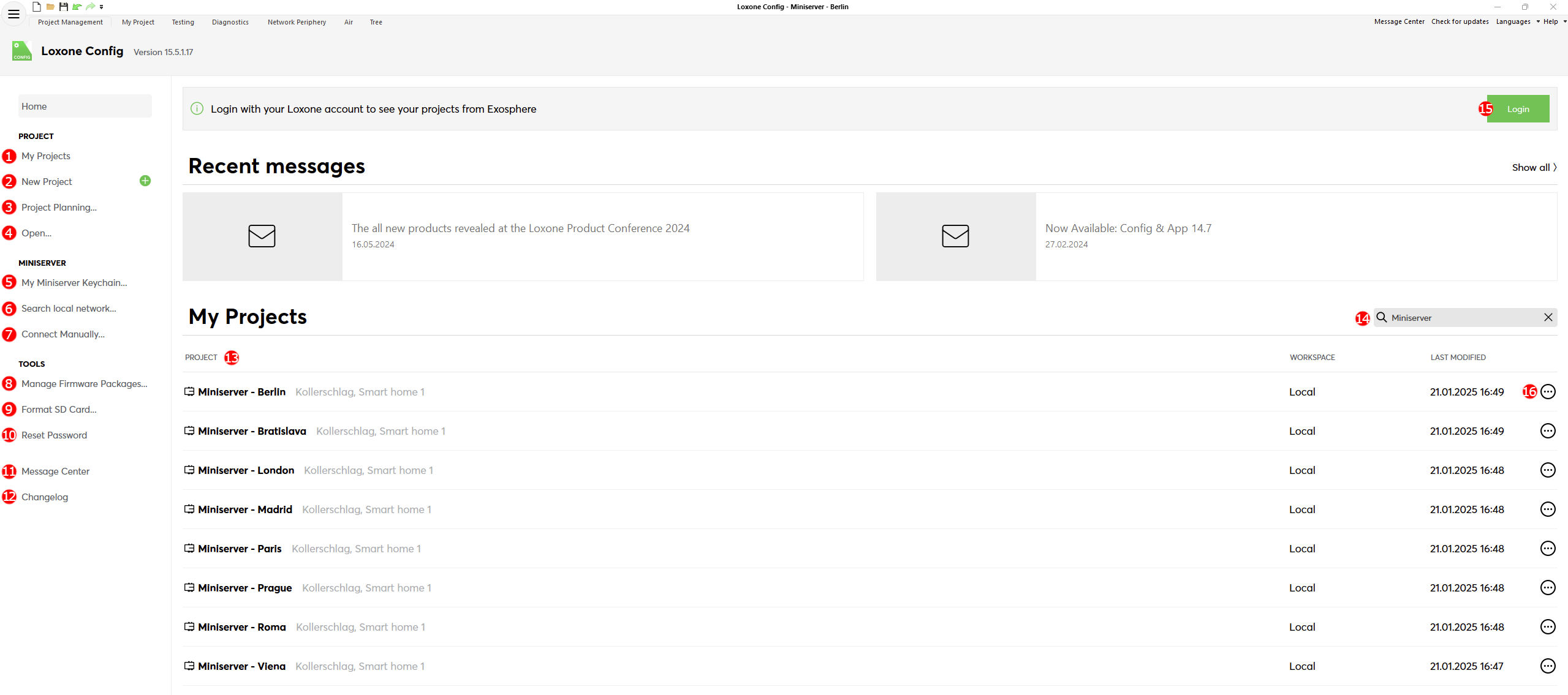 When opening Loxone Config, the start page allows you to open and manage the Loxone projects on your computer.