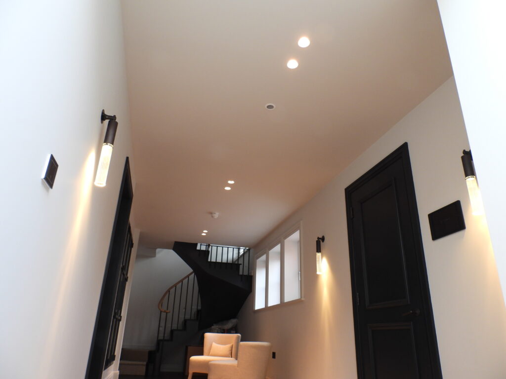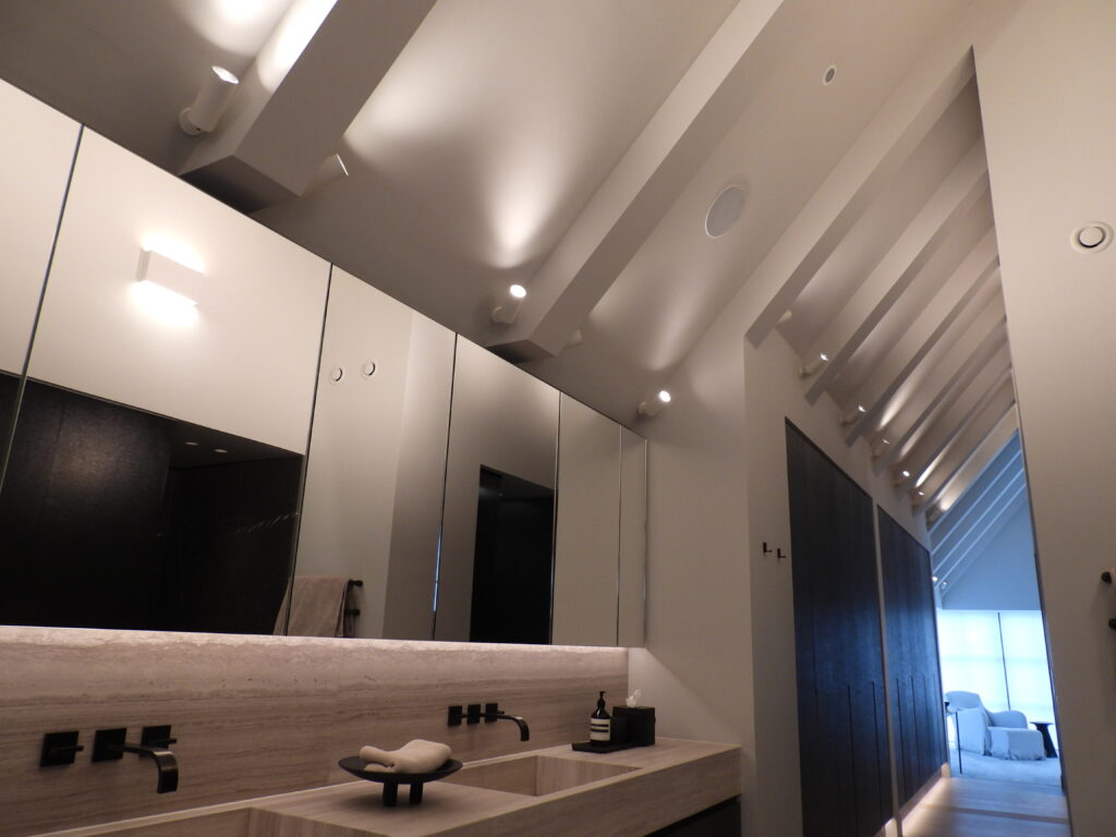 Lighting:We suggested the use of Orluna lighting for both the downlighting and uplighting, which we integrated into Loxone using Loxone Dali Extensions. These lights are implemented throughout the house due to their great colour rendering index and ability to smoothly dim. With most of the led strips in the coffers and dressing room being controlled using the Loxone RGBW dimmers. Dimmable 5 amp sockets are also used extensively throughout the house to provide even more flexibility. Loxone presence sensors are installed to automatically bring on lighting scenes.