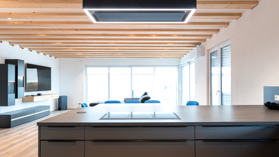 The owner also loves the home cinema. The “home cinema” mode can be activated with just one tap and the lighting, shading and multiroom audio are automatically adjusted. In addition, all rooms were equipped with speakers, so all rooms can be filled with the same or different music.