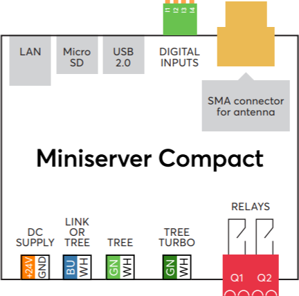 It features 2 dry relay contacts, 4 digital inputs. Up to 30 Extensions can be added to the Miniserver via the Link interface to add additional functions such as inputs, outputs or interfaces.