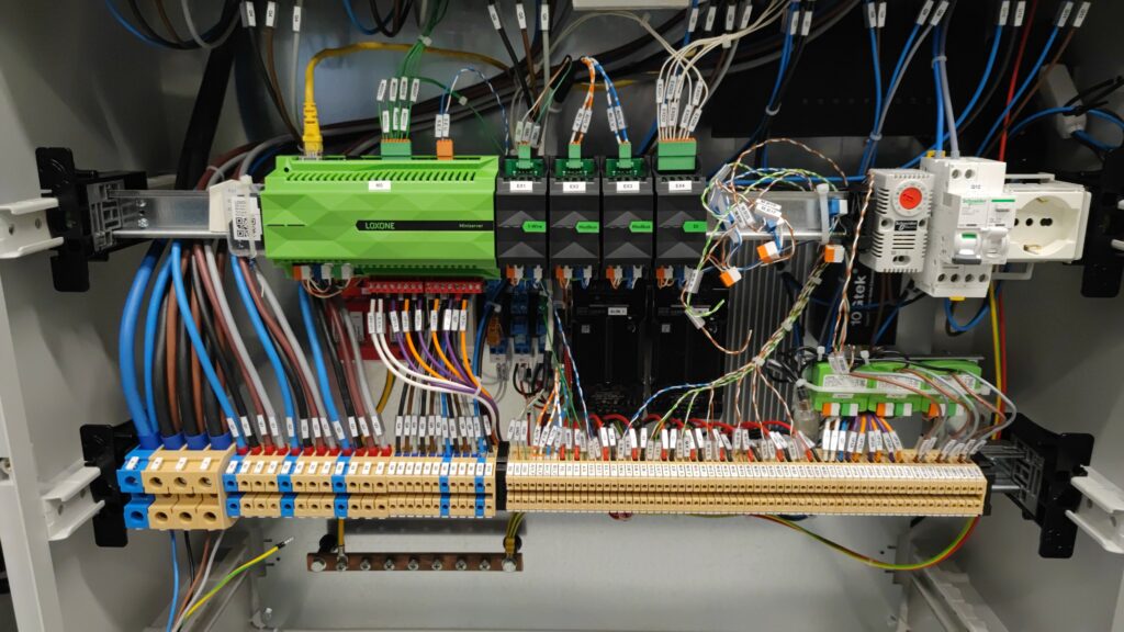 A panel tailored to the customer's needs was created in the workshop and placed in place of the old one. All with a service interruption of just two days. Field probes and a climate probe (for controlling temperature, humidity and CO2) have been added inside the shielded chamber. To overcome the impossibility of bringing metal cables inside the shielded room, a LAN network was created including copper/fiber converters so as to enter the shielding only with an optical fiber cable and inside the shielded room use an existing spare power supply to power the fibre/copper converter, the additional Miniserver and the climate probe connected to it.
