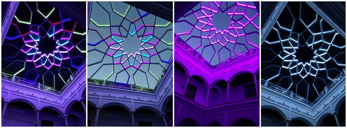 Este espacio se adapta a las necesidades del cliente dependiendo el tipo de evento que se realice en él, ya sea una reunión o una fiesta. Mediante el Miniserver y la DMX Extension, en combinación con más de 800 metros de tiras LED RGB, las retículas de cristal de la montera cambian de color pudiendo establecer diferentes modos de forma manual, temporizados por horario, calendarios de encendidos, entre otros.