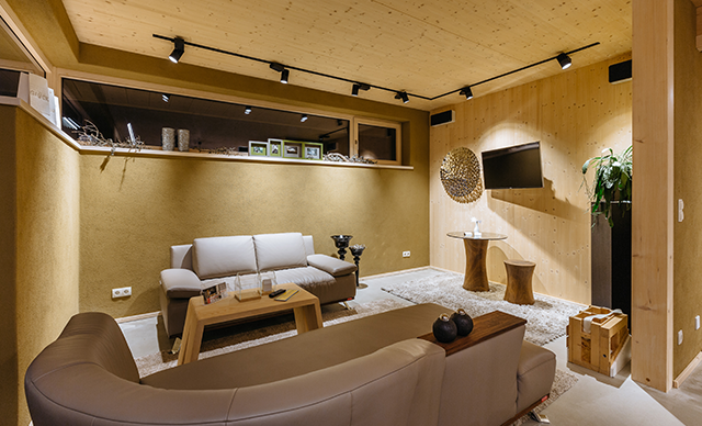 La Passivhaus Eisenstraße tiene 3 zonas de audio: salón, oficina y sótano. Los altavoces Loxone Speakerestán integrados en el techo y además incorpora algunos altavoces Wall Speaker, que no necesitan empotrarse. La ventaja de tener tres zonas diferenciadas es que puede reproducir música diferente de forma simultánea a las tres.