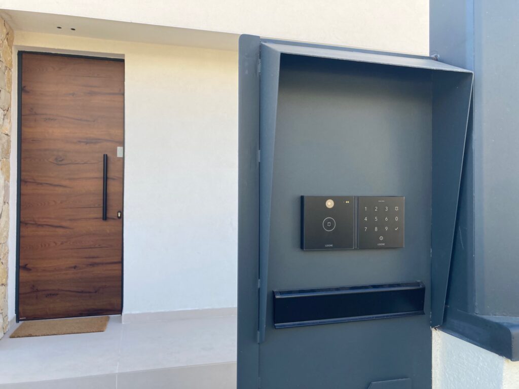 Para el control de acceso, utilizamos el Intercom junto con un teclado NFC Code Touch para identificar quién accede a la vivienda al abrir la puerta. Además, se controlan los motores de las puertas vehiculares, lo que permite accionarlas mediante la App. Todas las persianas están automatizadas con seguimiento solar, de esta manera, se sombrean las ventanas donde está incidiendo el sol en verano para apoyar el sistema de refrigeración. Las zonas de paso tienen la luz automatizada según presencia y luz ambiente pero, además, se pueden encender manualmente. Un pulsador Touch Pure permite el control de planta centralizado, tanto de luces como de persianas. Todas las luces exteriores se controlan con Loxone, el encendido es automático según la hora crepuscular.