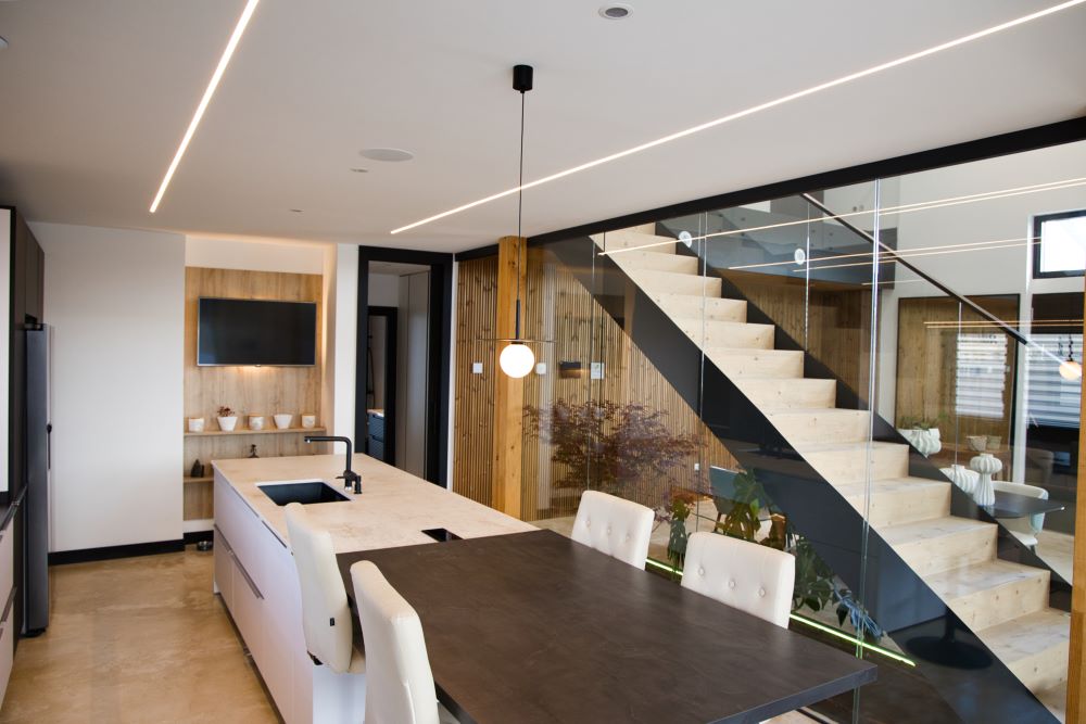 Aproximadamente el 80% de las luminarias de la vivienda son luces LED alimentadas a 24V. Esto no solo contribuye a reducir los campos electromagnéticos, sino que también facilita un control y regulación mucho más eficiente y preciso. En Casa Sophia, la tecnología se combina con la eficiencia para ofrecer una experiencia de iluminación avanzada y sostenible.