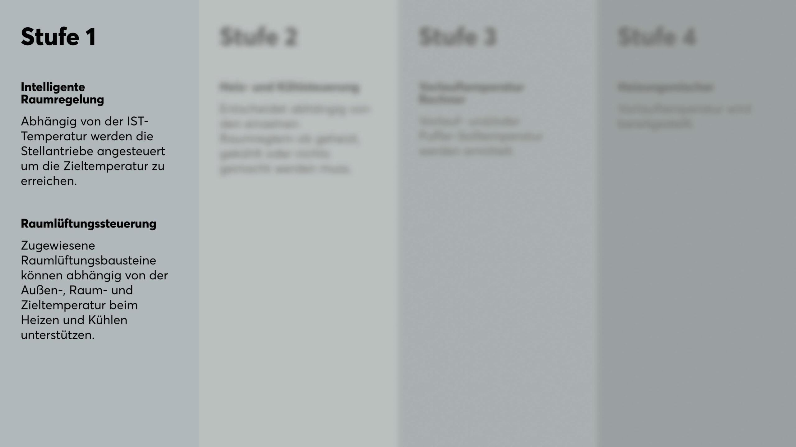En el primer nivel de integración de un sistema de calefacción, solo se regula el caudal a través de los actuadores motorizados. No se interviene directamente en el sistema de generación de calor. Si la temperatura exterior es superior a la interior, el sistema de ventilación puede ayudar a alcanzar la temperatura deseada.