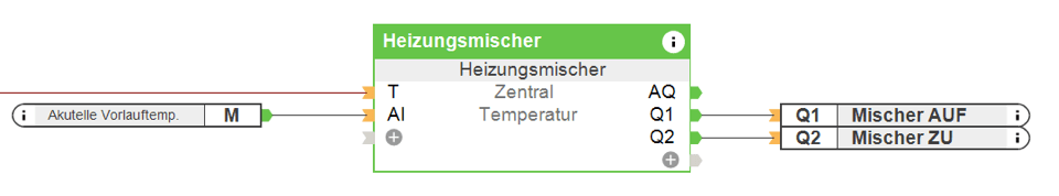 Para proporcionar la temperatura de impulsión calculada, se puede controlar la bomba de circulación a través del bloque de mezclador de calefacción. De este modo, se mezcla exactamente la temperatura de impulsión necesaria para cada momento.