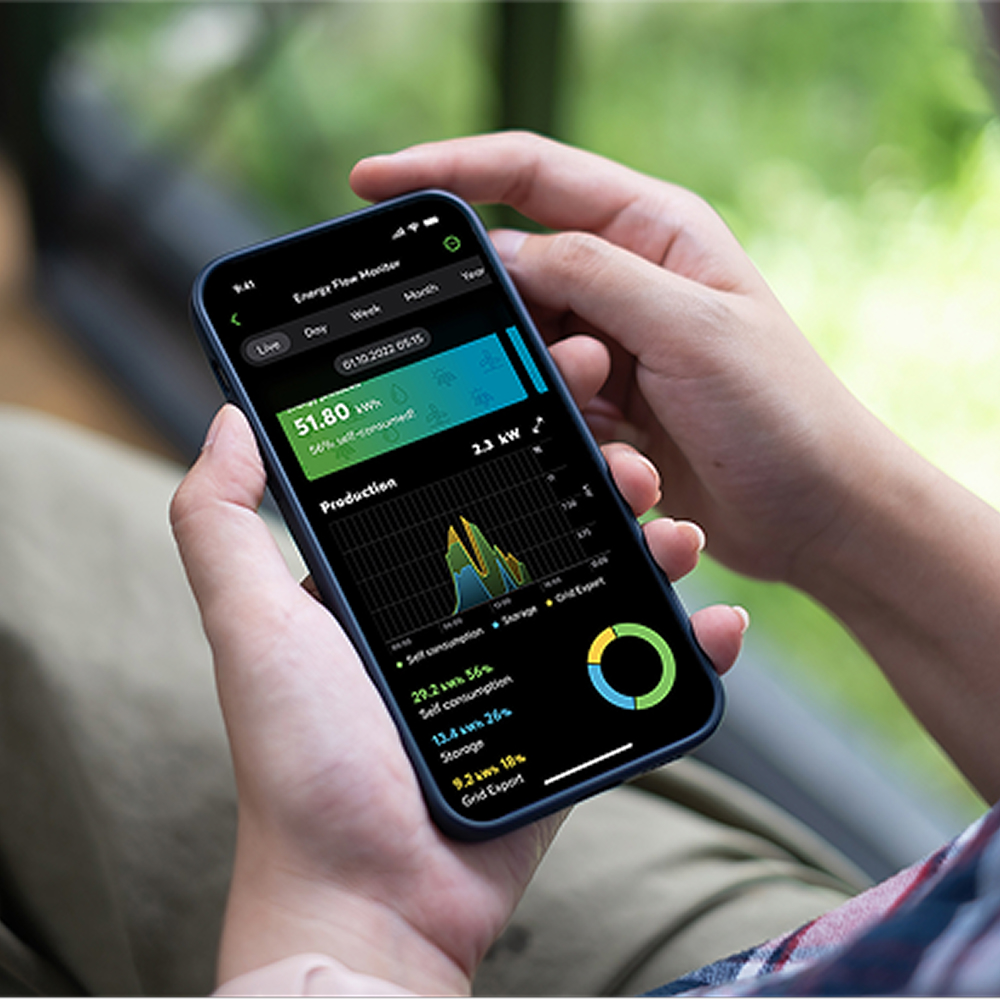 Avec l’application LOXONE, vous pouvez voir tous les flux d’énergie en temps réel : producteurs, consommateurs, stockage et réseau. Des fonctions telles que la gestion de la charge et l’optimisation des prix spot vous aident à utiliser l’énergie de manière efficace et à réduire vos coûts.