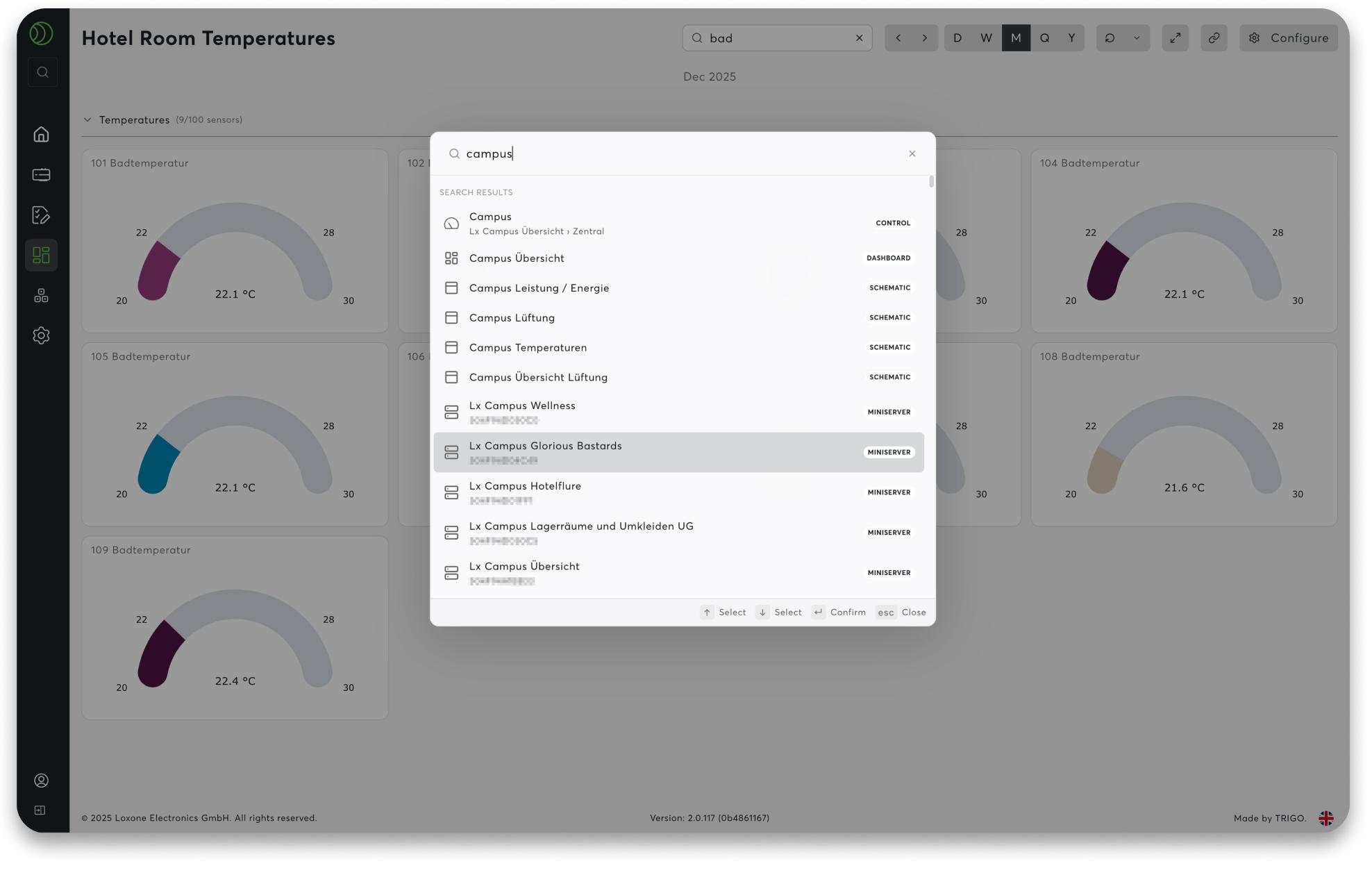 - « Aperçu des températures de toutes les chambres d’hôtel du campus Loxone » – toujours à jour, sans travail supplémentaire