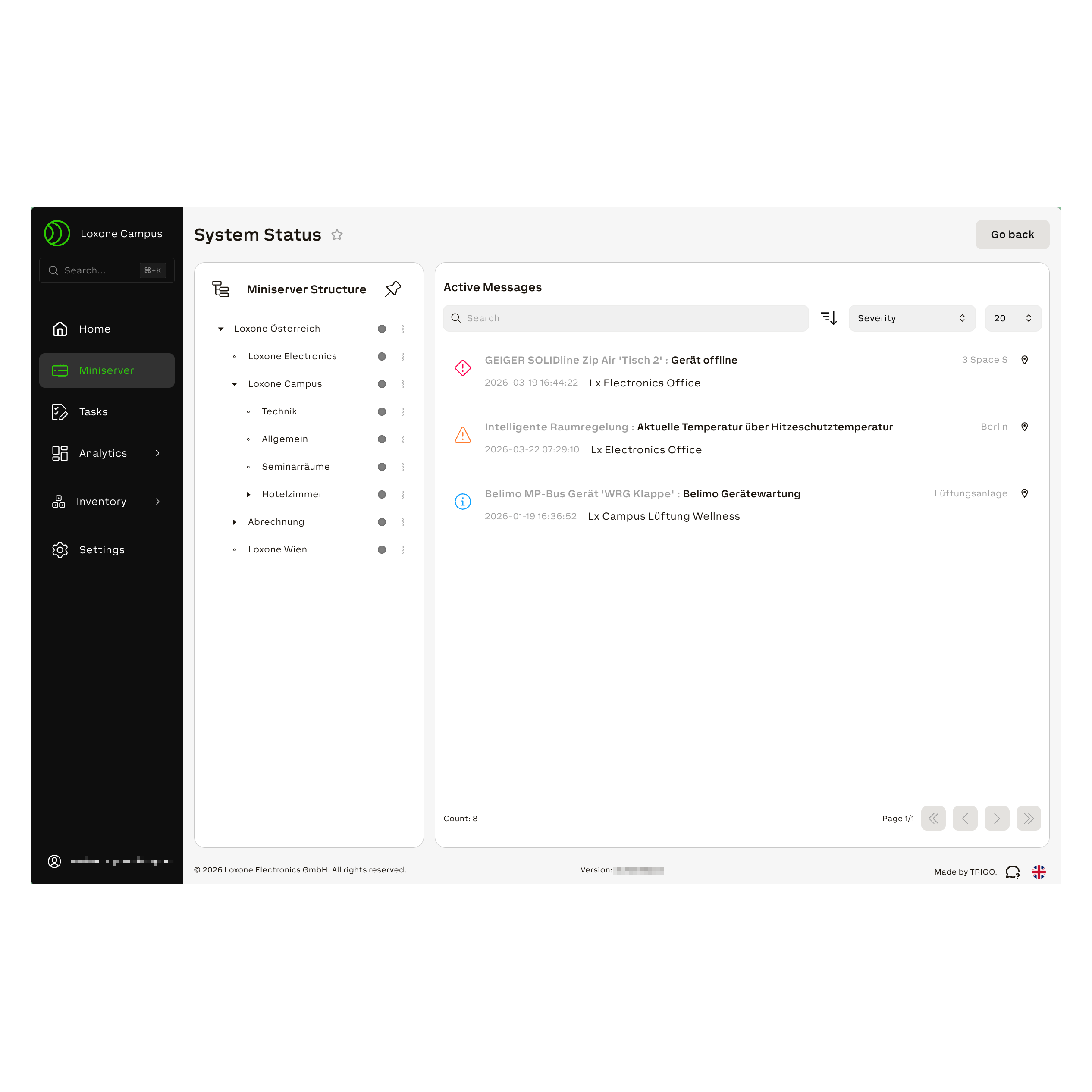 LOXONE Exosphere proactively and centrally monitors the status of your technical systems. Faults are detected before they cause a shutdown.