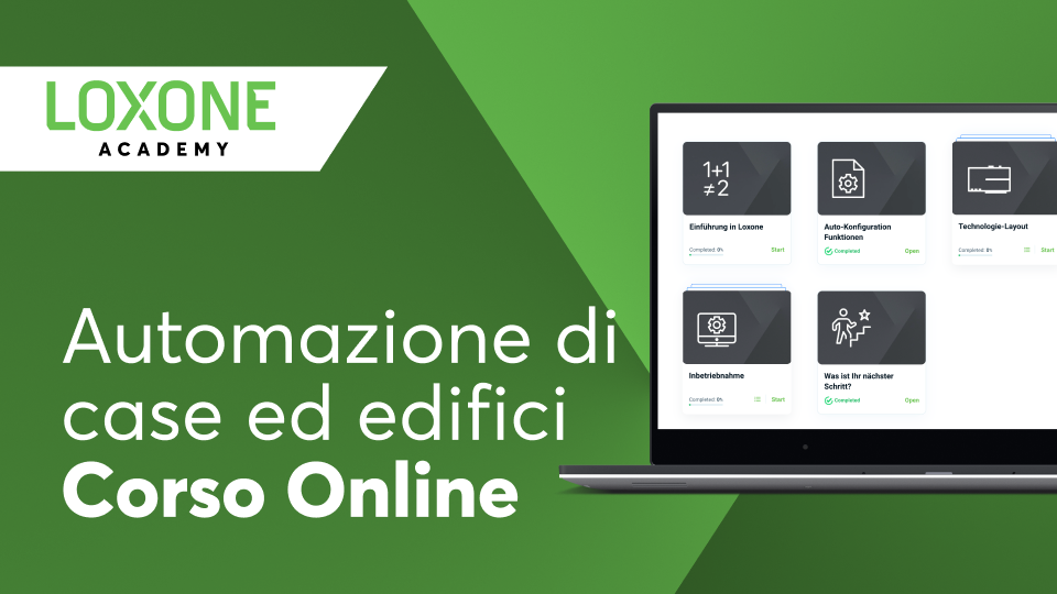 Il Corso Starter di Loxone è una piattaforma online che ti permette di seguire vari corsi al tuo ritmo. Imparerai le basi di Loxone passo dopo passo e avrai una panoramica del mondo Loxone, delle nostre soluzioni e dei vantaggi di una partnership.