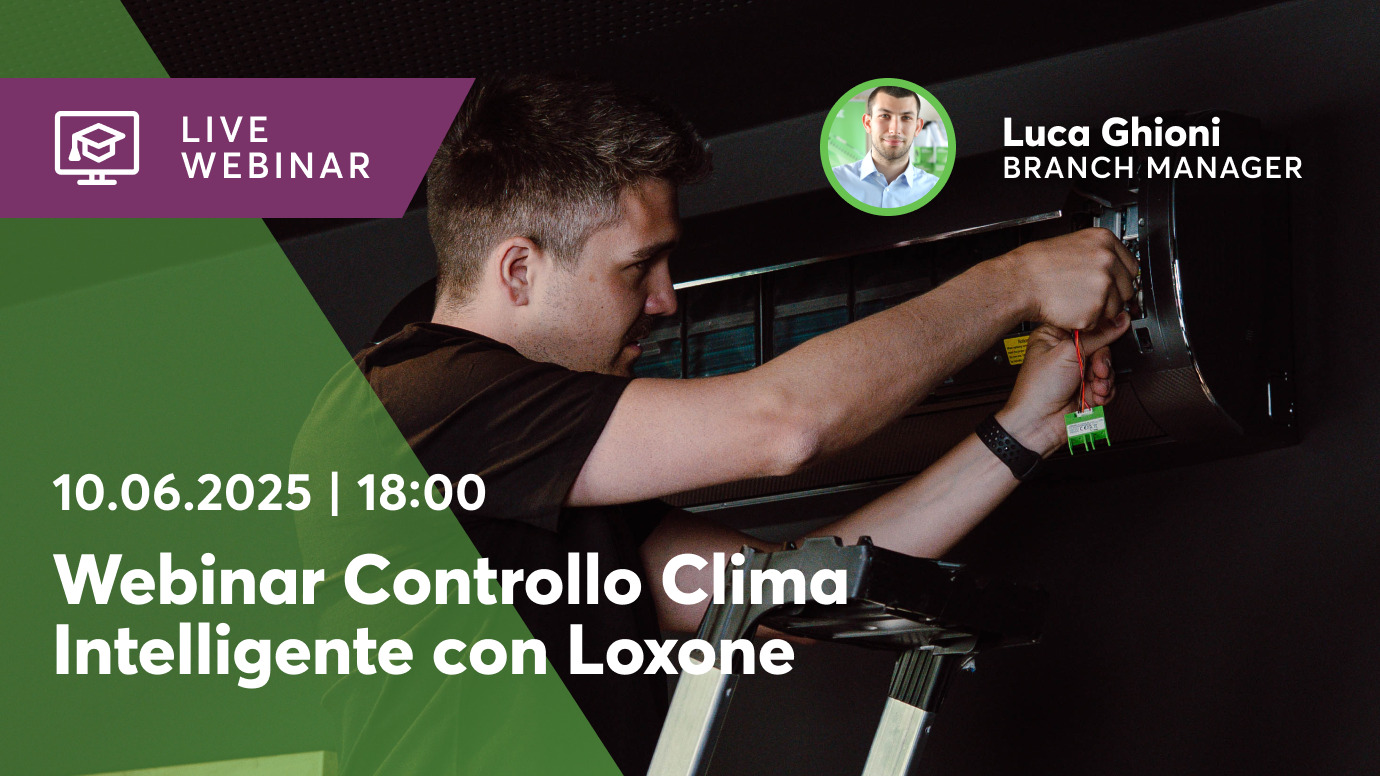 Unisciti a noi per un webinar dedicato al controllo clima con Loxone, dove esploreremo come trasformare impianti di climatizzazione tradizionali in sistemi smart e come crearne di nuovi, efficienti e integrati nella gestione energetica dell’edificio.