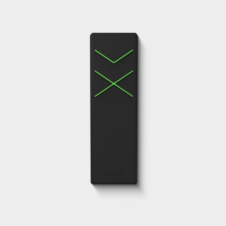Un tocco sul grande pulsante al centro accende l’illuminazione o cambia l’atmosfera luminosa. Con un tocco sul pulsante in alto a sinistra, la tapparella si solleva; toccando quello in basso a sinistra, si abbassa. A destra si controlla la musica. Un tocco sul pulsante in alto aumenta il volume e un tocco in basso lo diminuisce.