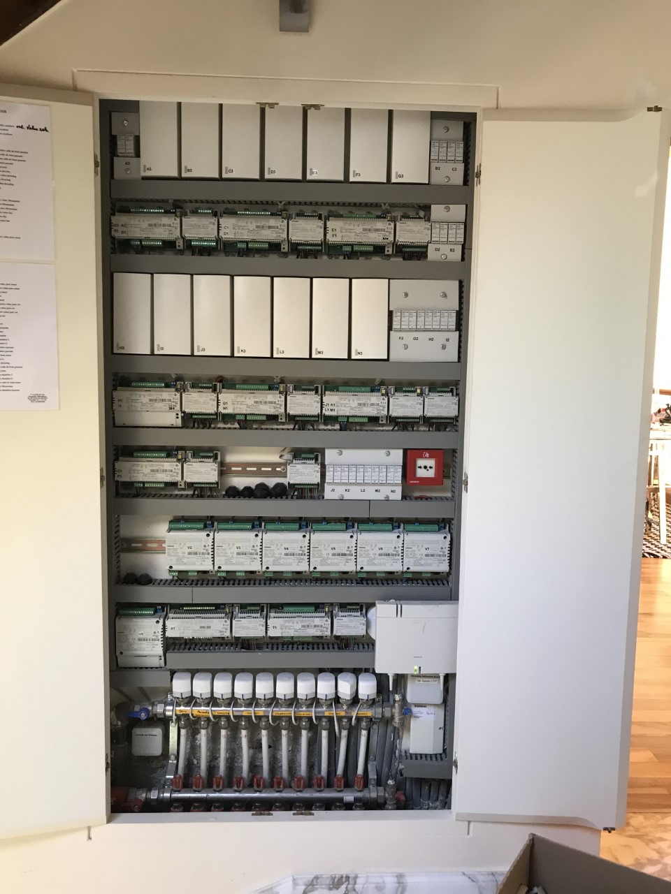 Na zdjęciu jest widoczna rozdzielnica w biurze Loxone. Po lewej stronie widać system Loxone, a po prawej wyłączniki potrzebne do zasilania urządzeń silnoprądowych takich jak gniazdka. Rozdzielnica jest tak mała, ponieważ według naszych standardów zawiera tylko Miniserver, Audioserver, kilka zasilaczy i wyłączników. Wszystkie pozostałe urządzenia są ukryte w sufitach podwieszanych i puszkach instalacyjnych.