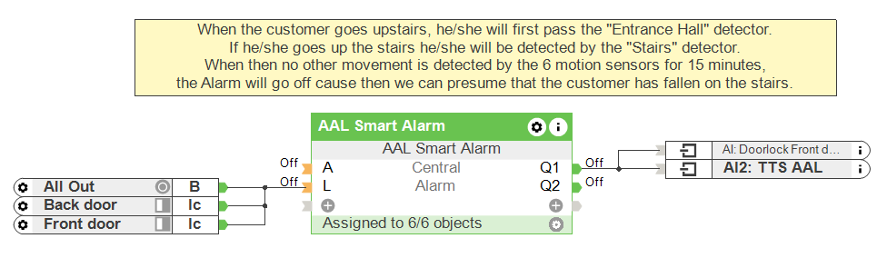 Moduł „AAL Smart Alarm” służy do wykrywania upadków lub nietypowego zachowania. Odpowiednie czujniki obecności można wybrać w oknie dialogowym konfiguracji. Gdy tylko ruch w pomieszczeniu nie zostanie wykryty, timer zaczyna odliczać ustalony wcześniej okres czasu. Jeśli nie zostanie zarejestrowany żaden dalszy ruch, po upływie czasu obserwacji zostanie uruchomiony alarm. Czas obserwacji jest definiowany w zależności od typu pokoju i może być ustawiony indywidualnie. Proces ten jest dezaktywowany przez wejście „Opuszczenie domu” (L).