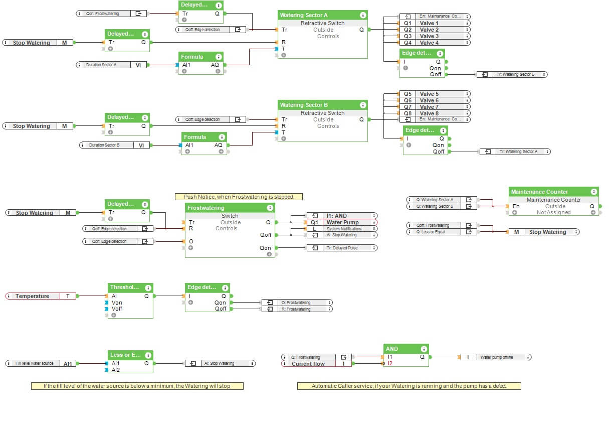 Jeśli pole roślin uprawnych jest podzielone na kilka sektorów, muszą one być zraszane jedno po drugim lub dwa jednocześnie. Ciśnienie w rurze nie byłoby wystarczająco wysokie, aby nawadniać wszystkie pola naraz. Proces automatyzacji reguluje,