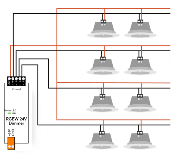 Dimmer RGBW został opracowany do instalacji w odpowiedniej szafie rozdzielczej na szynie DIN. Compact Dimmer może być używany bez specjalnej skrzynki instalacyjnej (np. umieszczony bezpośrednio na suficie lub meblach). Staraj się, aby długość przewodów była jak najkrótsza.