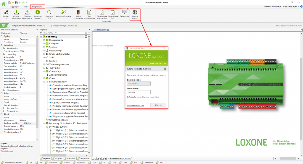 W celu uruchomienia diagnostyki, wyświetlenia konkretnej funkcji programu lub demonstracji nowej funkcji, mamy bezpośrednio w Loxone Config zintegrowany program TeamViewer.