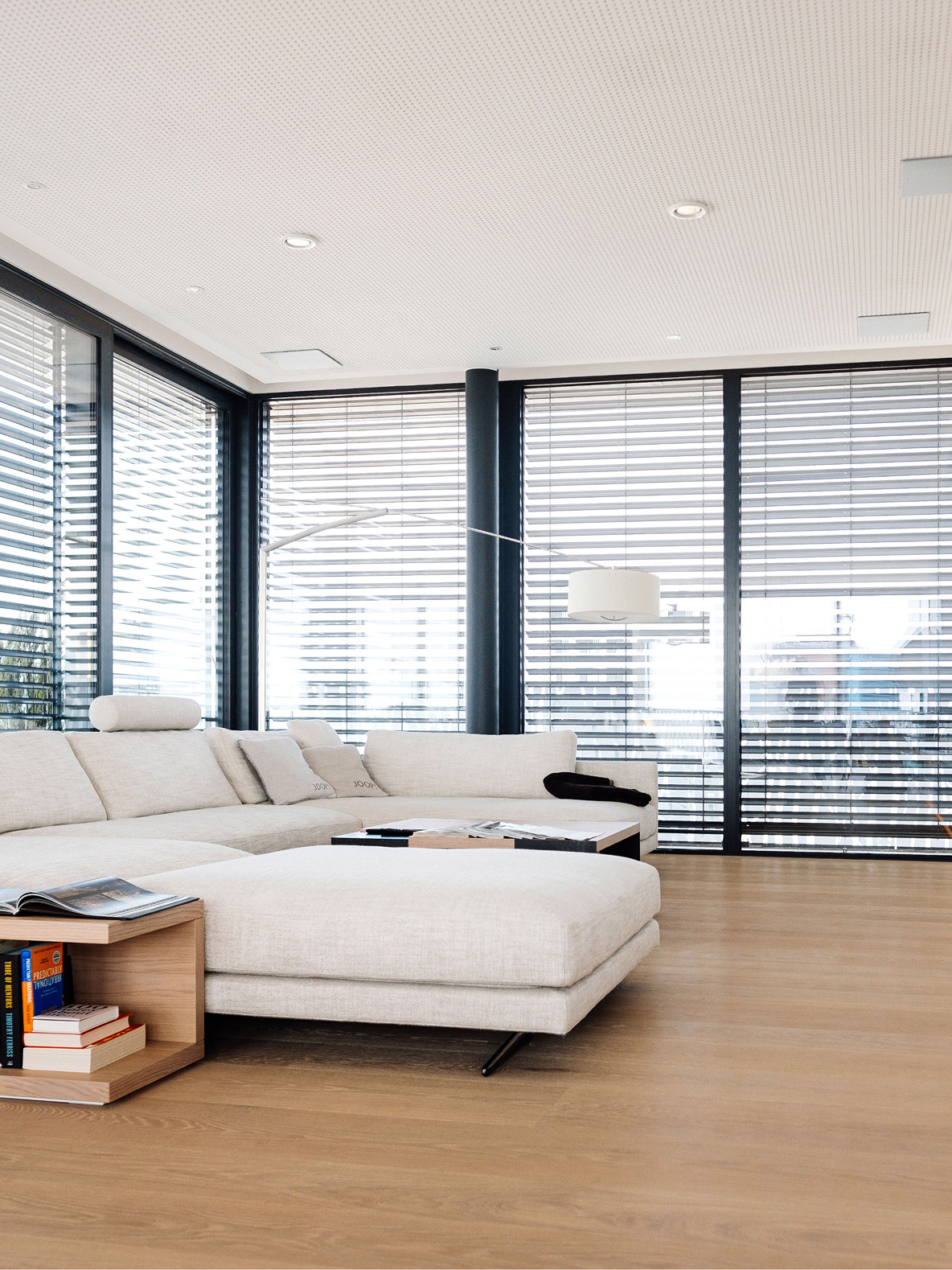 Niezależnie od tego, czy są to żaluzje, rolety, markizy czy plisy — każdy rodzaj osłony przeciwsłonecznej można łatwo zintegrować z całym systemem. Rozwiązanie można elastycznie dopasować do architektury budynku, jego przeznaczenia i indywidualnych potrzeb.