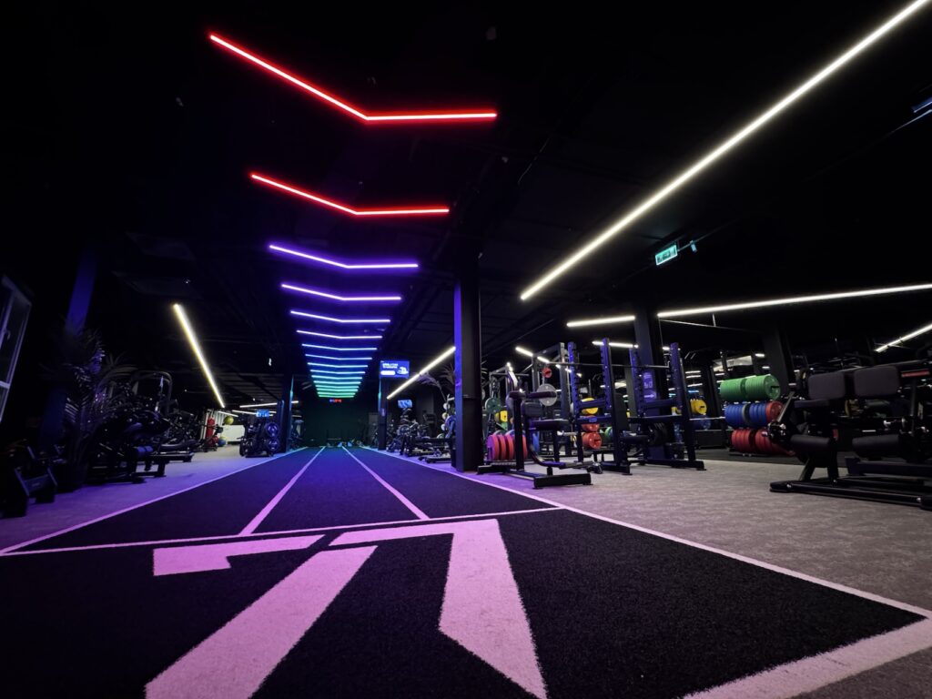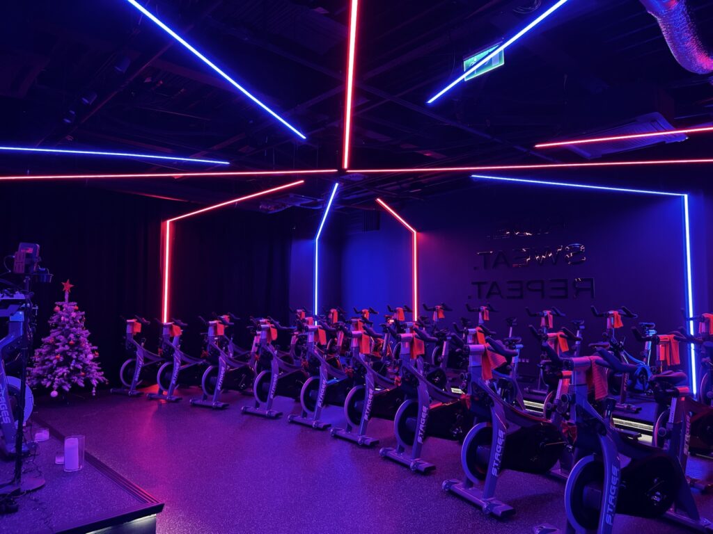 One of the biggest technical challenges was the dynamic lighting elements in the form of the so-called "running arrows" in the color spectrum, which create a movement and orientation effect in the space, as well as the spinning room, where the intensity and color of the lighting automatically adapt to the pace and difficulty of the training. This achieved a strong visual experience that supports the motivation of exercisers and completes the overall atmosphere of the training.